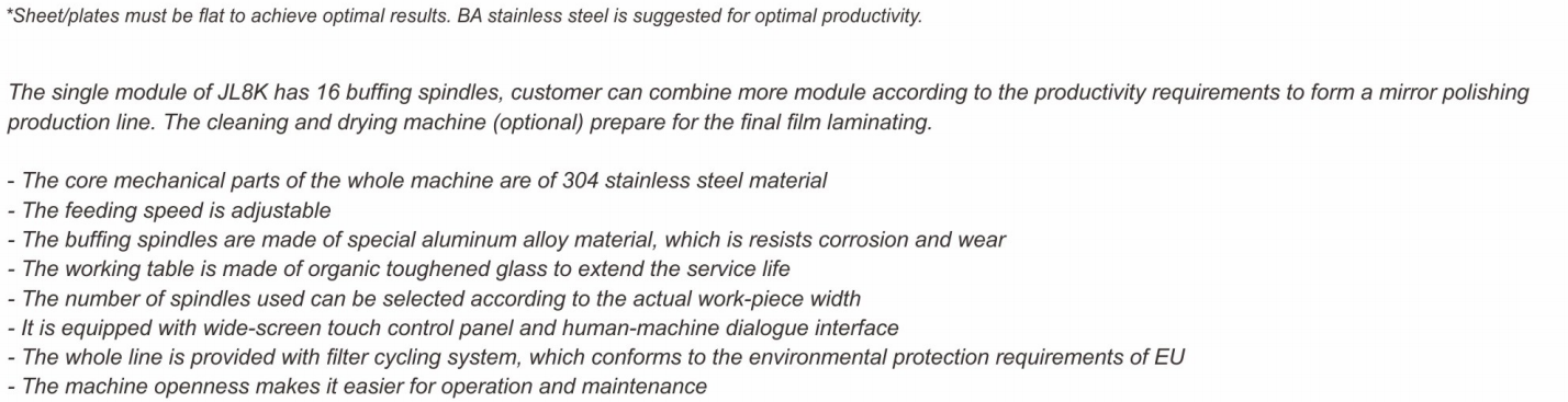 The mirror is characterized by low roughness and high reflection rate, and it is very difficult to distinguish from the real mirror. Through the mature technical support, Ji Li Jia newly developed JL8K mirror buffing machine in 2014 which has 2 patent certifications. The special buffing abrasive technology with the non-directional movement orbit can eliminate the micro defect in any direction, commonly called 8K mirror, which is characterized by: